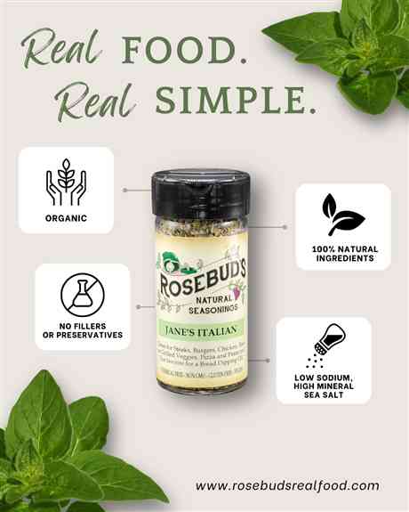 Rosebud's Real Food is dedicated to bringing the best of nature to your kitchen with our range of organic seasonings, fruit butters, herbs and spices, gluten-free baking mixes, and more! Our all-natural, organic seasoning mixes are made with a low sodium, high mineral sea salt, giving you the best absorption of nutrients. Our fruit butters are crafted with local, non-sprayed, or certified organic fruit, local honey and local maple syrup, providing a delicious, wholesome spread that's perfect for any meal or snack.We believe in the power of high-quality ingredients, sourcing our herbs and spices from trusted farms to ensure maximum flavor and nutritional benefits. Our products are free from artificial additives, fillers, or anti-caking agents. Whether you're a gourmet chef or a home cook, Rosebud's Real Food has something to elevate every dish to make mealtime simple, nutritious, and delicious!